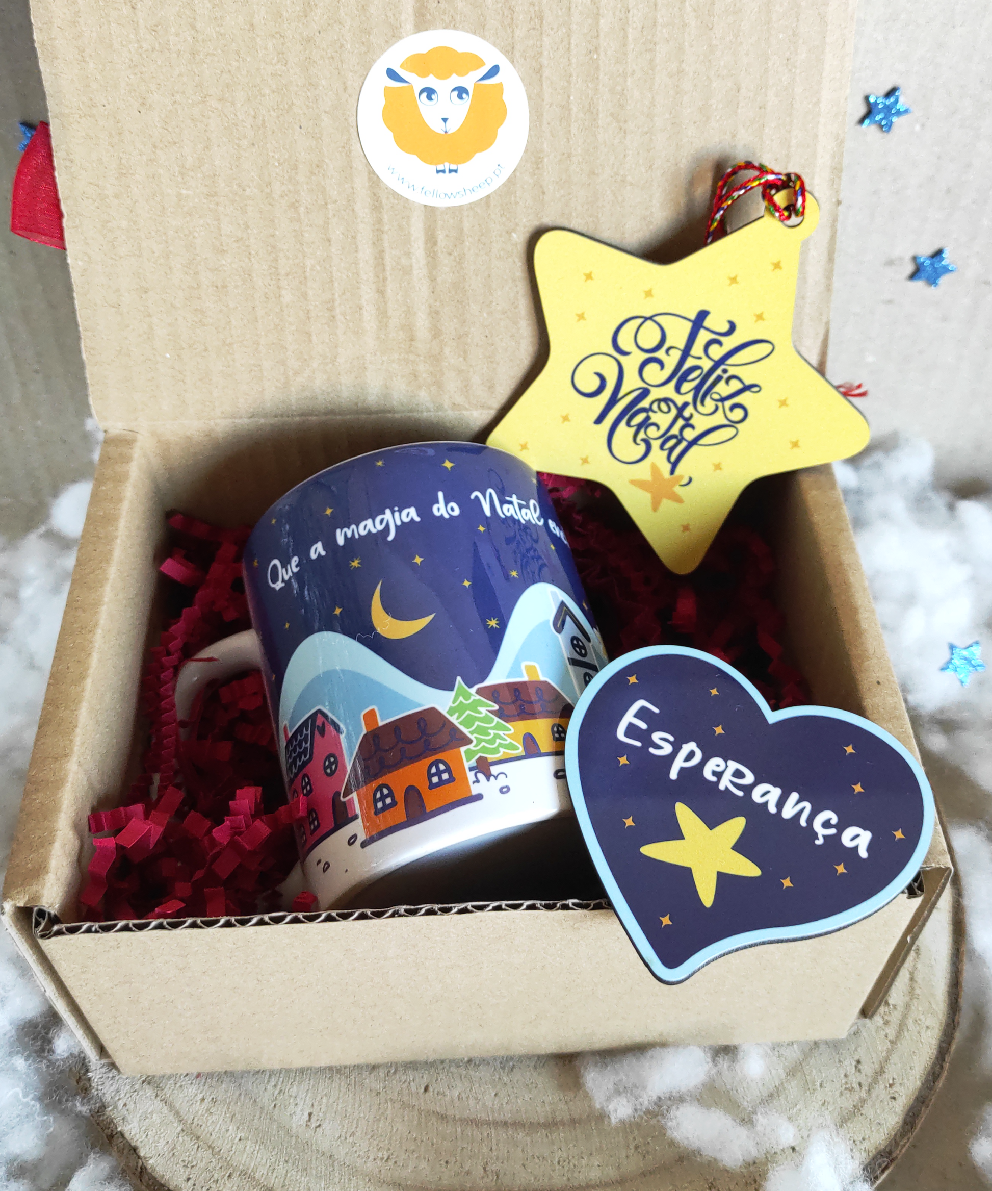 Box caneca, íman e pendente em MDF - Aldeia de Natal