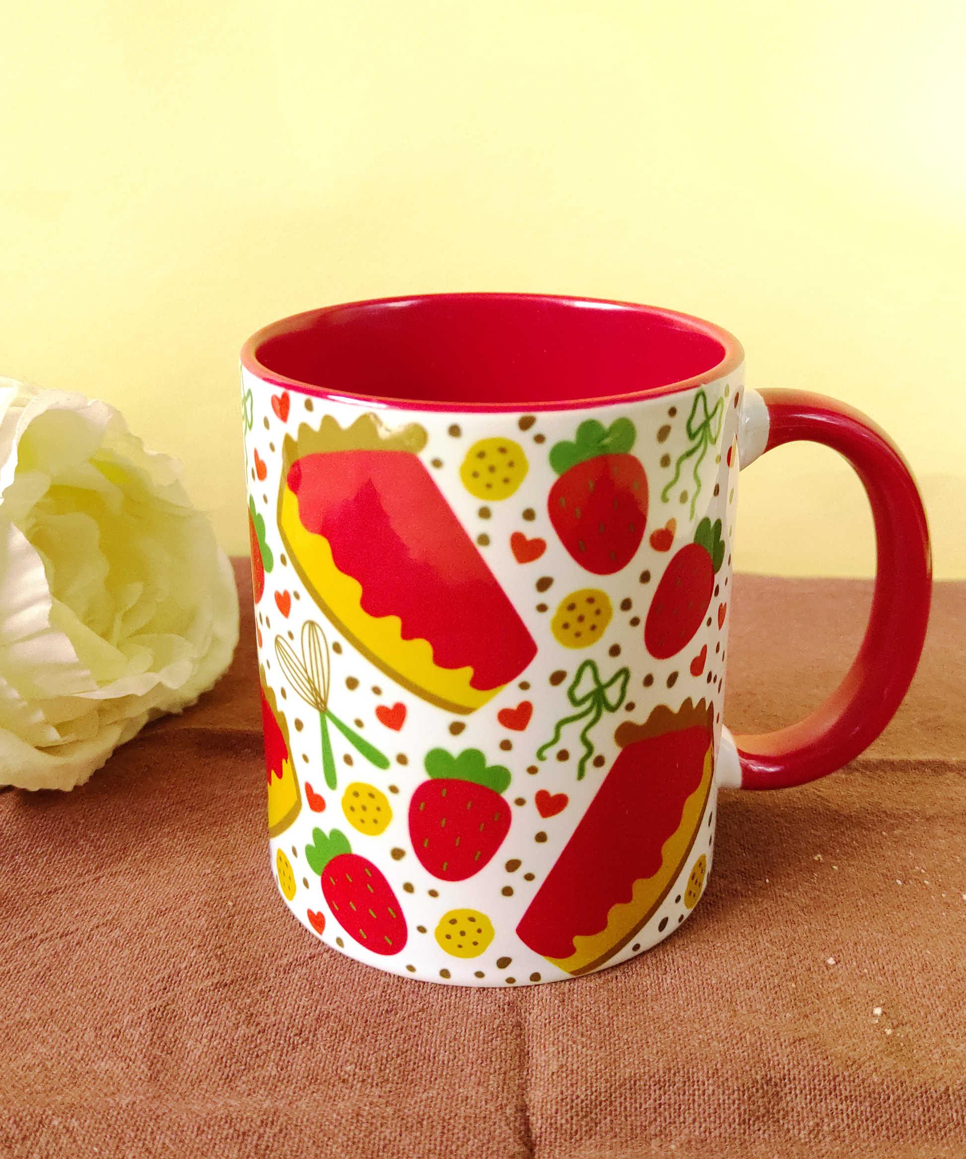 Esta caneca é ilustrada com cheesecakes, morangos, bolachas e corações, num padrão criado no atelier da Fellow Sheep.