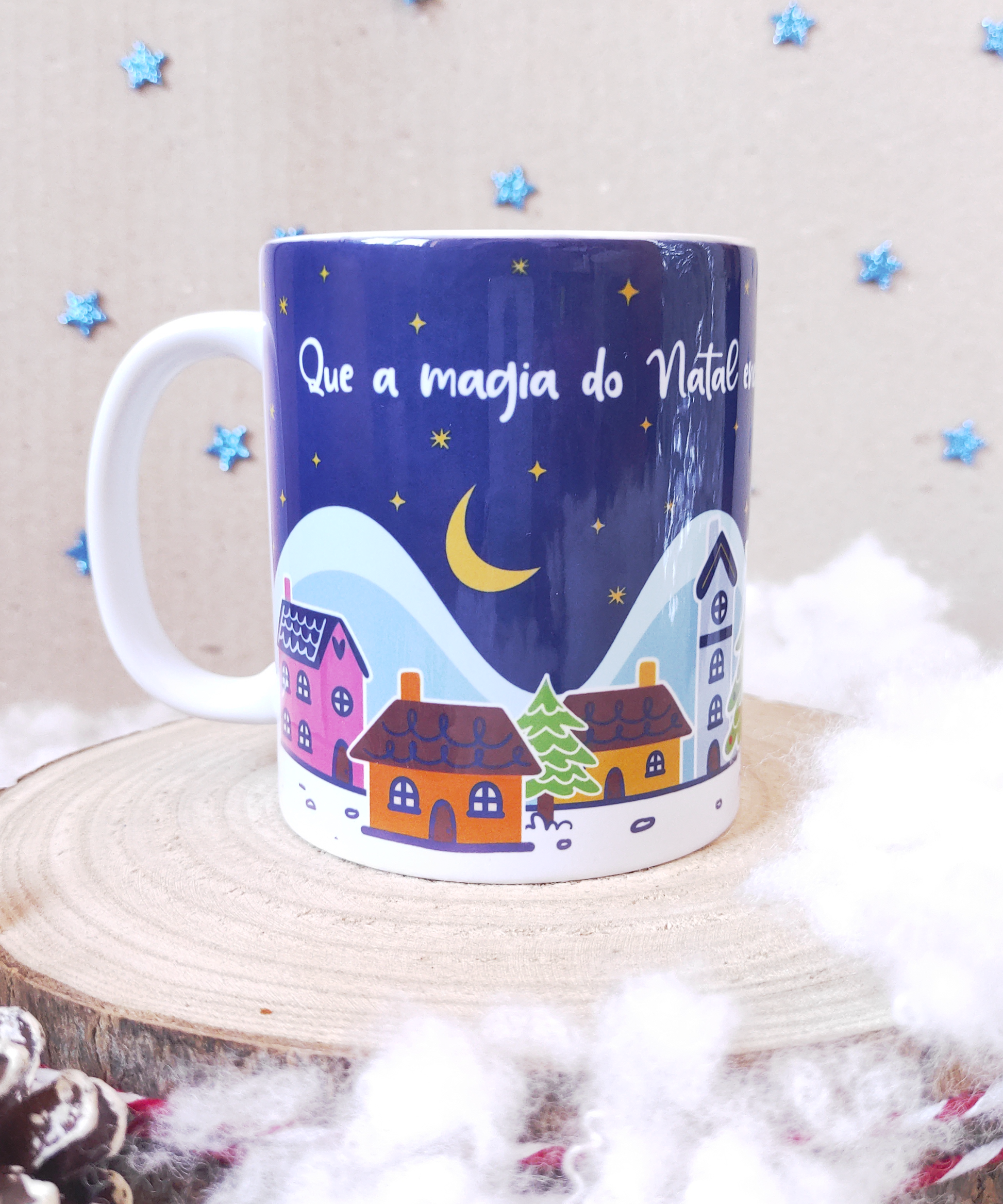 Inspirada no encanto de uma aldeia de Natal, a nossa caneca de Natal, Sonhos de Natal é perfeita para aquecer o coração e fazer da tua rotina um momento especial. Com a mensagem "Que a magia do Natal encha o teu coração de alegria", esta caneca de natl traz um toque festivo e acolhedor a cada gole, seja de chá, café ou chocolate quente.